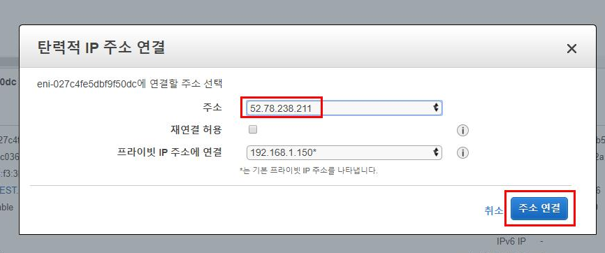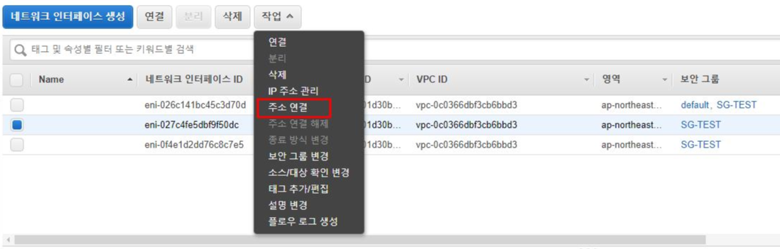 서브넷 네트워크 대역대에 해당하는 임의의 고정 IP 지정 8. 새로 생성된 네트워크 인터페이스를 선택하고 작업 탭에서 '주소 연결'을 합니다. (사전에 여분의 EIP를 생성한 다음, 주소 연결 대상을 생성한 EIP로 설정합니다.)