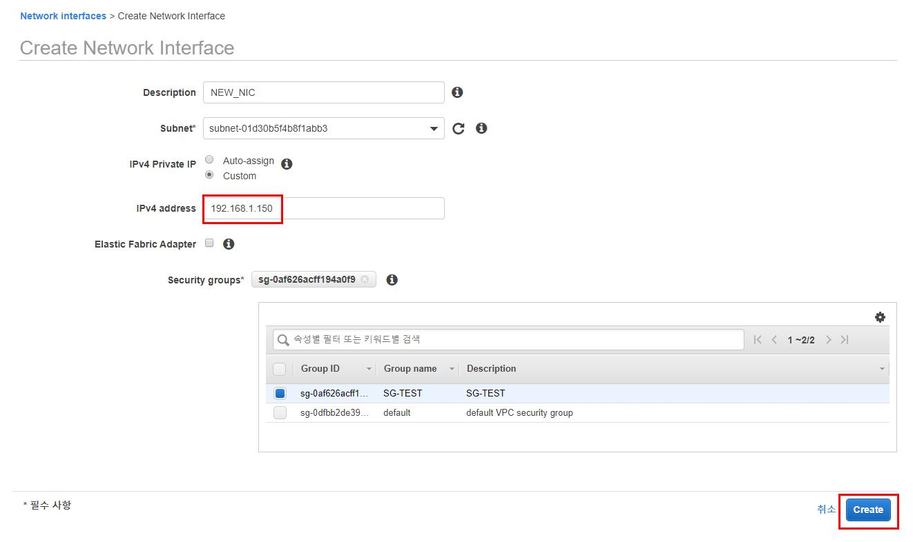 7. AWS 콘솔상의 EC2 서비스에서 네트워크 인터페이스 페이지로 넘어가 새로운 네트워크 인터페이스를 생성합니다.