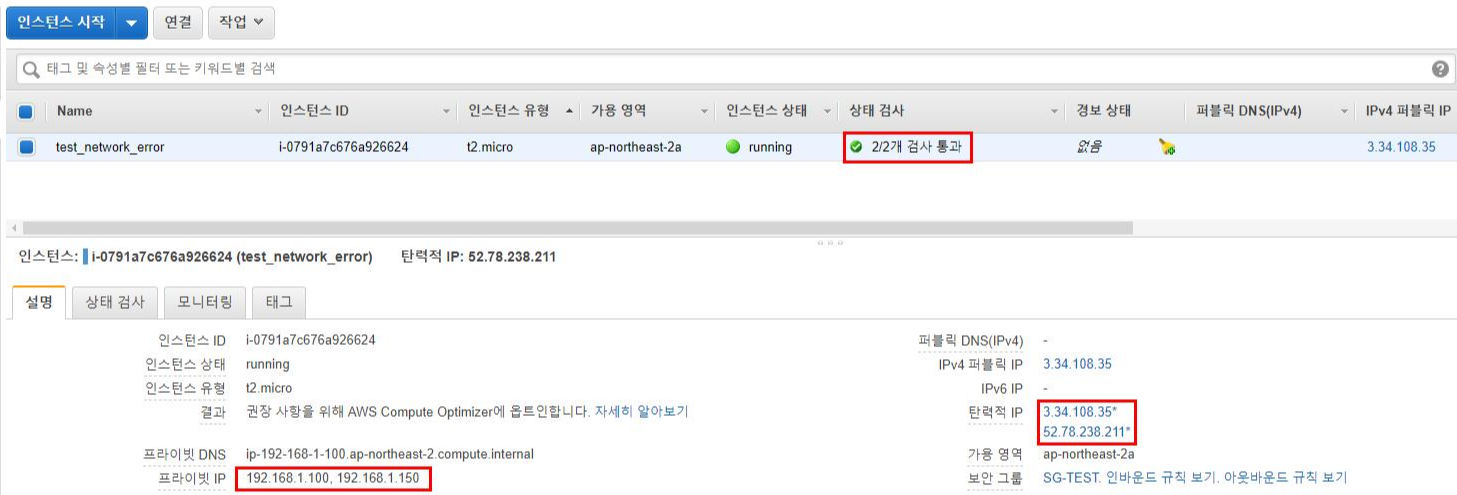 10. Attach를 끝내고 해당 인스턴스를 EC2를 중지 -> 시작하면 상태 검사가 정상적으로 돌아온 것을 확인할 수 있습니다. 또한 새로운 네트워크 인터페이스를 포함하여 프라이빗, 퍼블릭 각각 2개의 IP가 할당된 것을 확인할 수 있습니다.