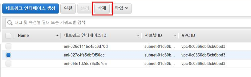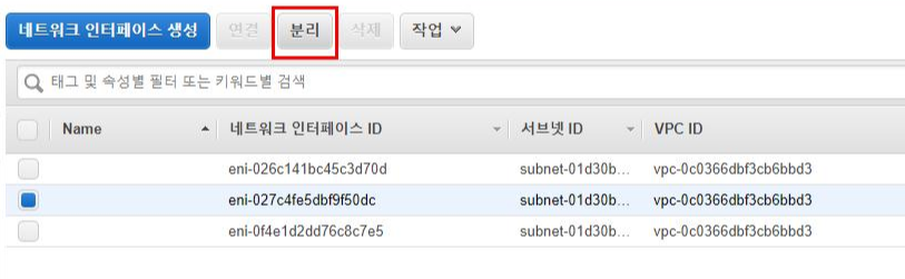 14. 새로 연결한 네트워크 인터페이스를 분리하고, 더 이상 활용하지 않으므로 삭제합니다. (맵핑된 EIP는 잊지말고 별도의 릴리즈 과정을 거쳐야 원치않는 요금 발생을 방지할 수 있습니다.)