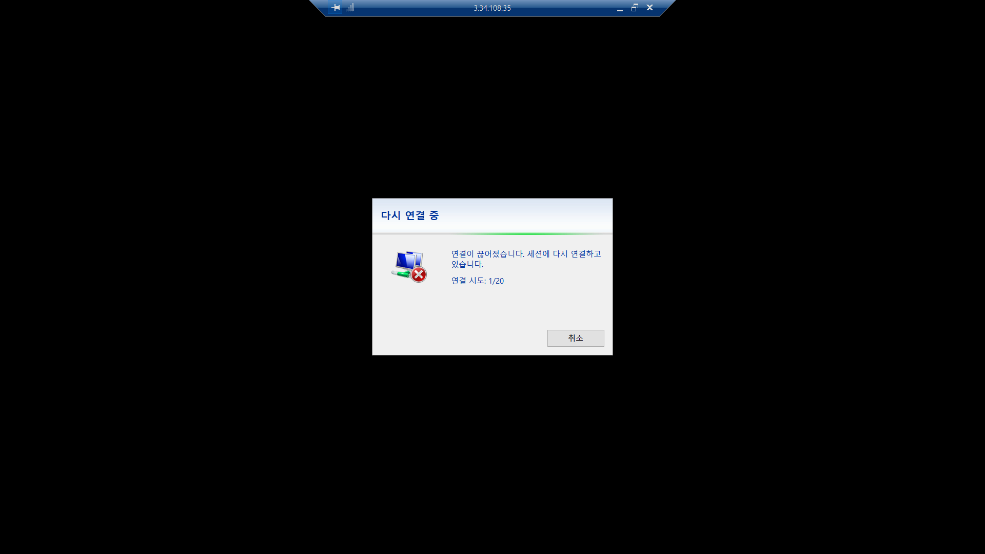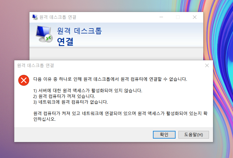 기존 IP 192.168.1.100 -> 의도적으로 틀린 IP 192.168.1.200 4. 확인을 누르면 네트워크 오류가 발생하여 원격 연결이 해제됩니다.