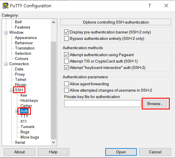 - 'Private key file for authentication'의 'Browse..'를 클릭합니다.