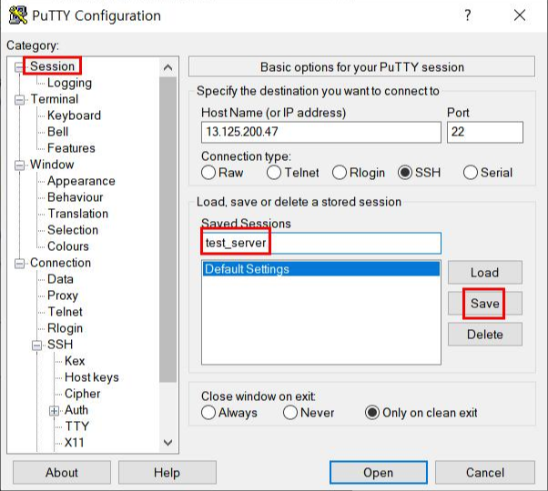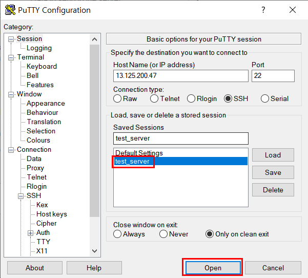 - 'Host Name'에 접속하고자 하는 서버의 도메인 또는 ip를 입력합니다. (SSH 접속이기 때문에 'Port'는 22으로 유지합니다.)