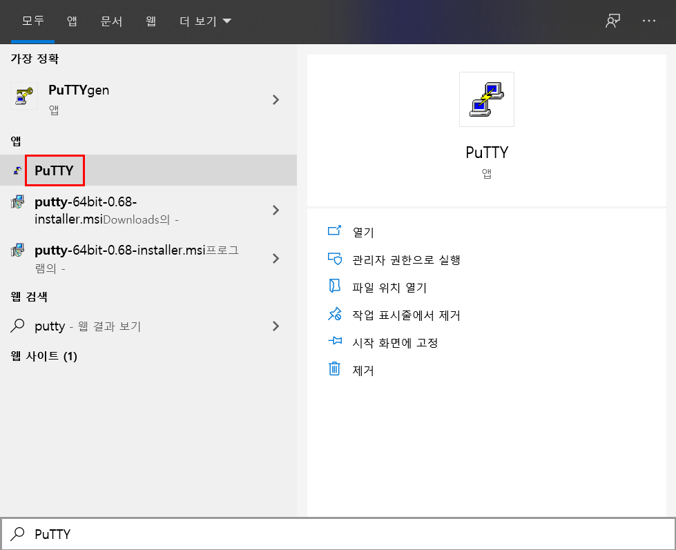 - 설치가 완료되고 나면 Putty를 실행합니다.