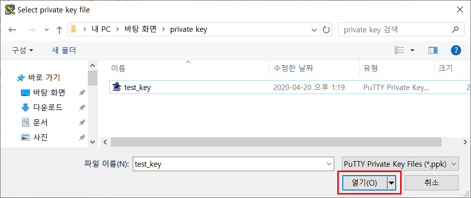 - 접속하고자 하는 서버의 공개키와 한 쌍인 개인키를 불러옵니다. (사전에 미리 보관하고 있는 개인키가 있어야합니다.)