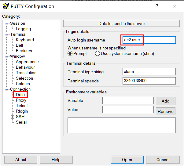 - Auto-login username 텍스트 박스에 접속하고자 하는 서버의 user를 입력합니다. (Amazon Linux 2의 경우 Default username은 'ec2-user')